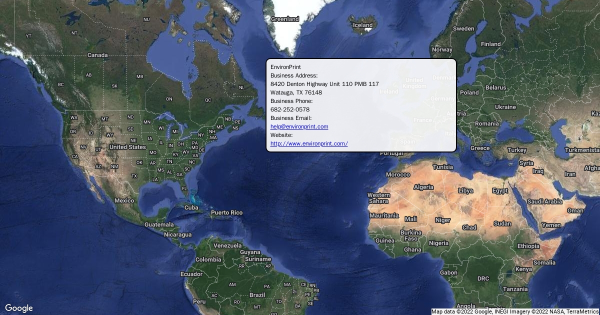 Business Address: 8420 Denton Highway Unit 110 PMB 117 Watauga, TX 76148 Business Phone: 682-252-0578 Business Email: help@environprint.com Website: http://www.environprint.com/
