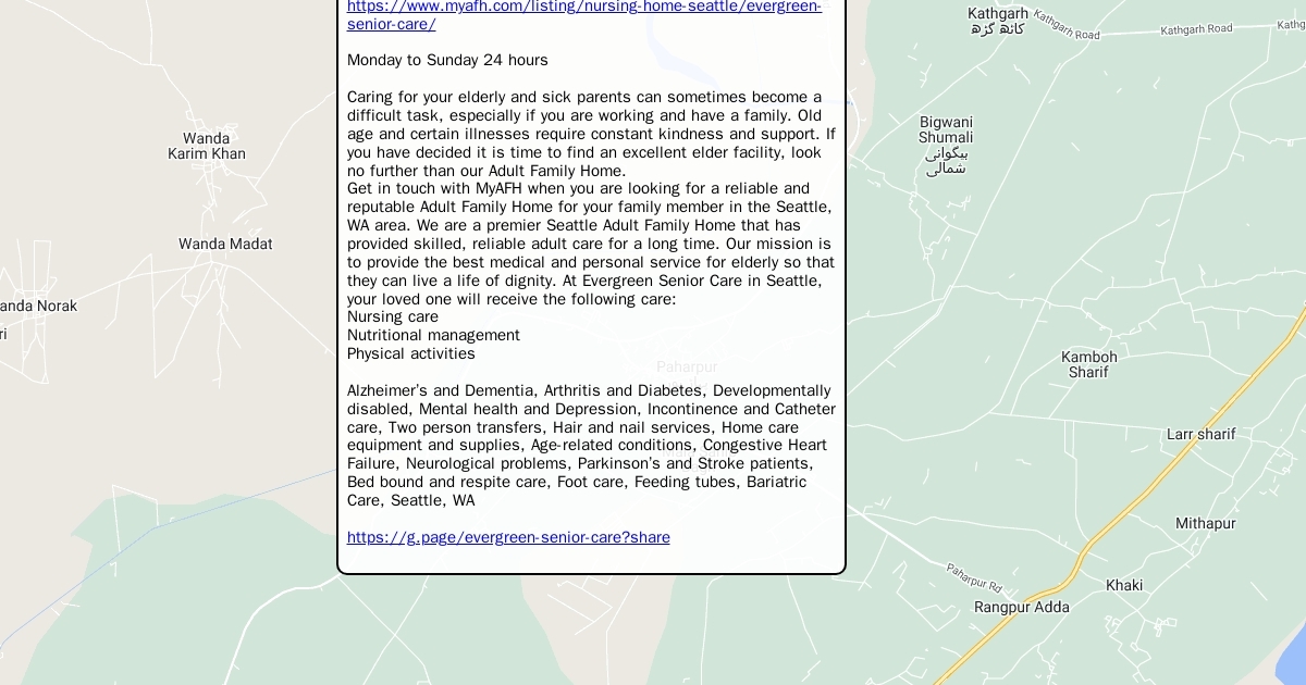 11605 4th Ave SW Seattle, WA 98146 (206) 309-5855 https://www.myafh.com/listing/nursing-home-seattle/evergreen-senior-care/ Monday to Sunday 24 hours