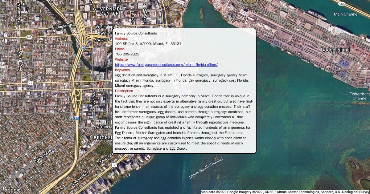 Address 100 SE 2nd St #2000, Miami, FL 33131 Phone 786-209-2325 Website https://www.familysourceconsultants.com/miami-florida-office/ Description Family Source Consultants is a surrogacy company in Miami Florida that is unique in the fact that they are not only experts in alternative family creation, but also have first-hand experience in all aspects of the surrogacy and egg donation process. Their staff include former surrogates, egg donors, and parents through surrogacy; combined, our staff represents a unique group of individuals who completely understand all that encompasses the significance of creating a family through reproductive medicine.