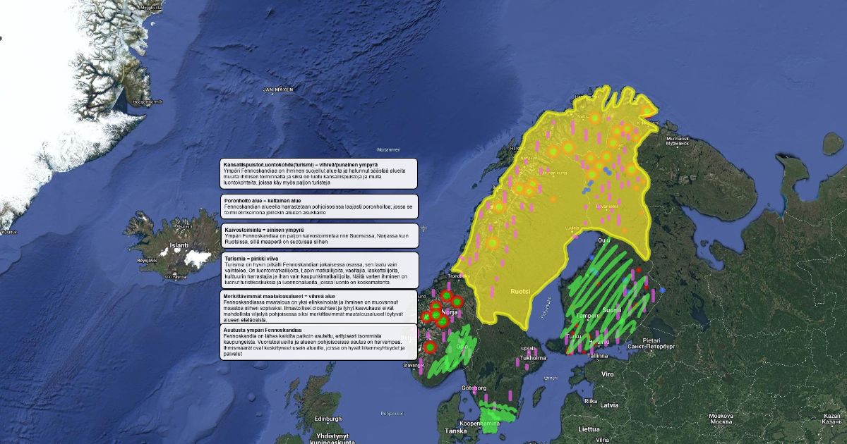 Kartassa näkyy turismissakin oleellisia luontokohteita, porotaloutta, turismia, kaivostoimintaa