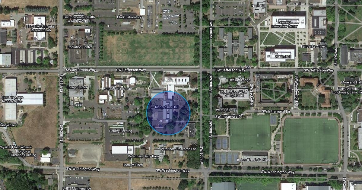 The blue circles indicate the on-campus primary lab location and the OSU CoF owned field site location.