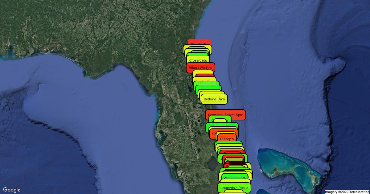 The map shows all the popular and local surf spots along the east coast, with colors depicting the level of experience to be able to surf each spot.