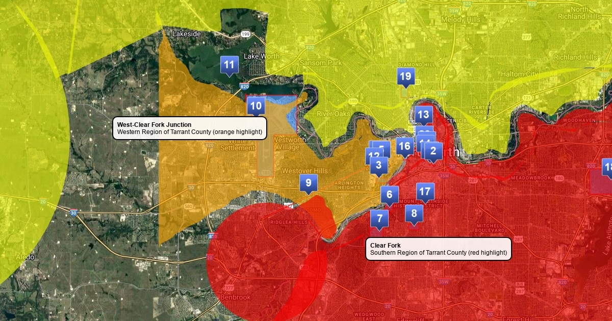 Map of Fort Worth, TX with 20 distinct features of the city.