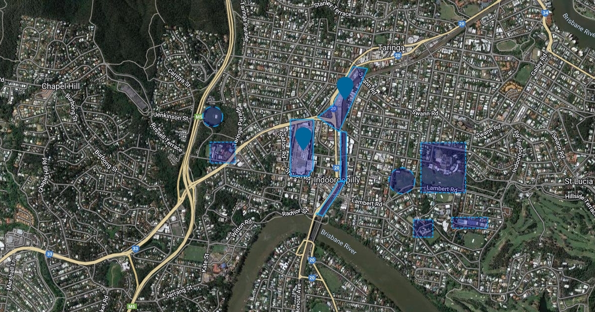 Map of Indooroopilly, where to put trees, schools, parks and places with no trees.