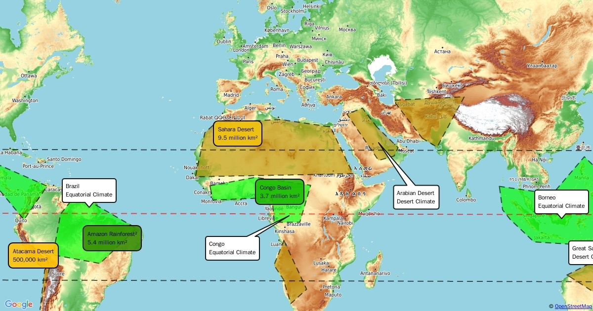 Global distribution of equatorial rainforest and hot desert climates