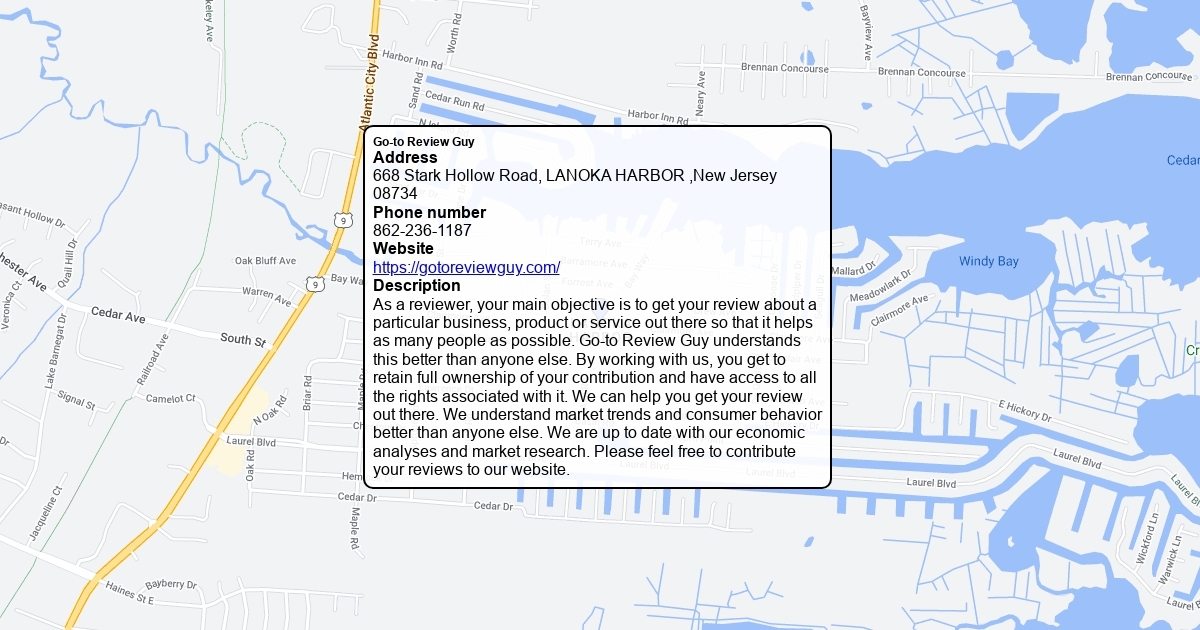 Address 668 Stark Hollow Road, LANOKA HARBOR ,New Jersey 08734 Phone number 862-236-1187 Website https://gotoreviewguy.com/ Description As a reviewer, your main objective is to get your review about a particular business, product or service out there so that it helps as many people as possible. Go-to Review Guy understands this better than anyone else. By working with us, you get to retain full ownership of your contribution and have access to all the rights associated with it. We can help you get your review out there. We understand market trends and consumer behavior better than anyone else. We are up to date with our economic analyses and market research. Please feel free to contribute your reviews to our website.