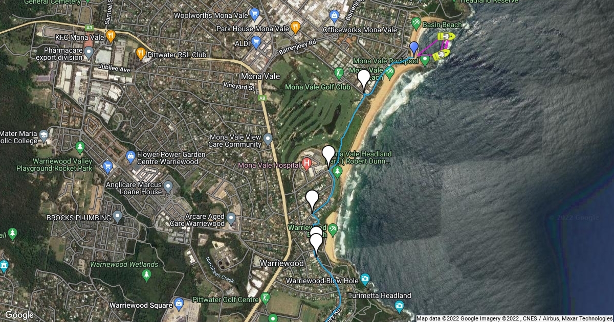 This is the running route that the participants will take from Mona Vale Basin Beach to Chocolate Box Training Gym in Cromer.
