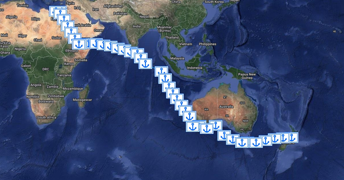 A map of the voyage of the Orari from Wellington, New Zealand to Alexandria, Egypt.