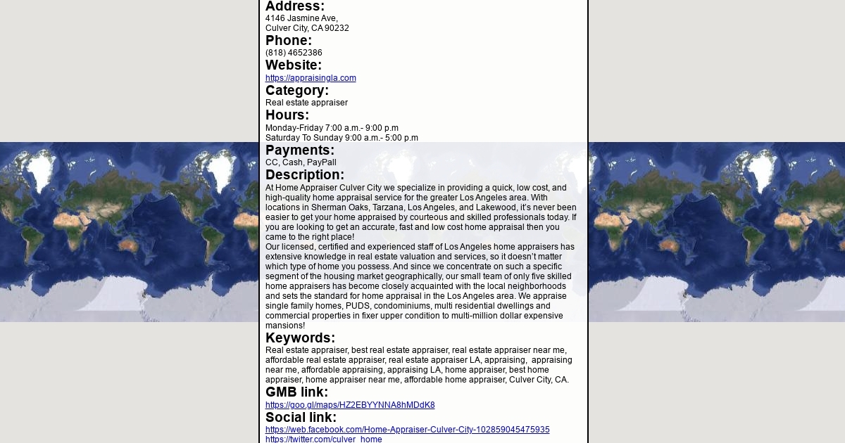 Address: 4146 Jasmine Ave, Culver City, CA 90232 Phone: (818) 4652386 Website: https://appraisingla.com Category: Real estate appraiser Hours: Monday-Friday 7:00 a.m.- 9:00 p.m Saturday To Sunday 9:00 a.m.- 5:00 p.m Payments: CC, Cash, PayPall
