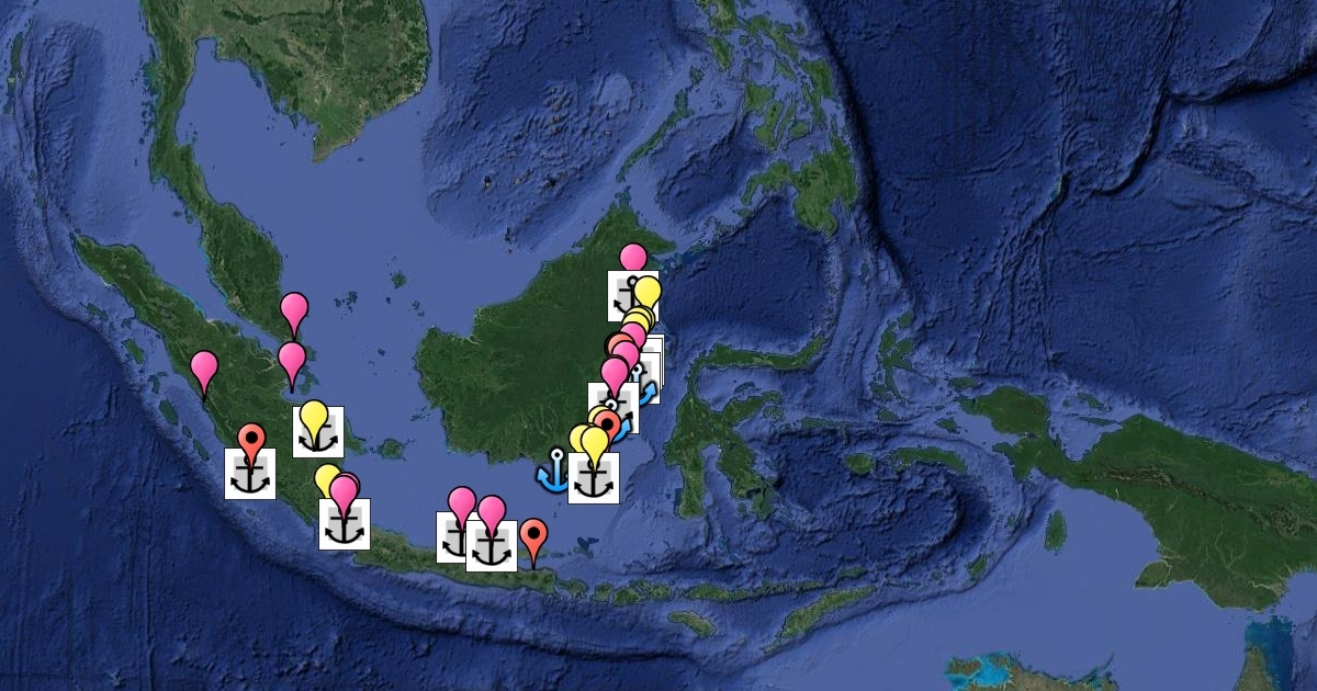 summary of data from Marine Traffic and Global Energy Monitor. yellow marker: ports covered in our vessel tracking (VT), blue anchor: anchorages covered in our VT, pink marker: port not in VT but listed in marine traffic (MT), grey anchor: anchorages not in VT but listed in MT, red marker: port not in VT and cannot be found in MT, but listed in Global Energy Monitor.
