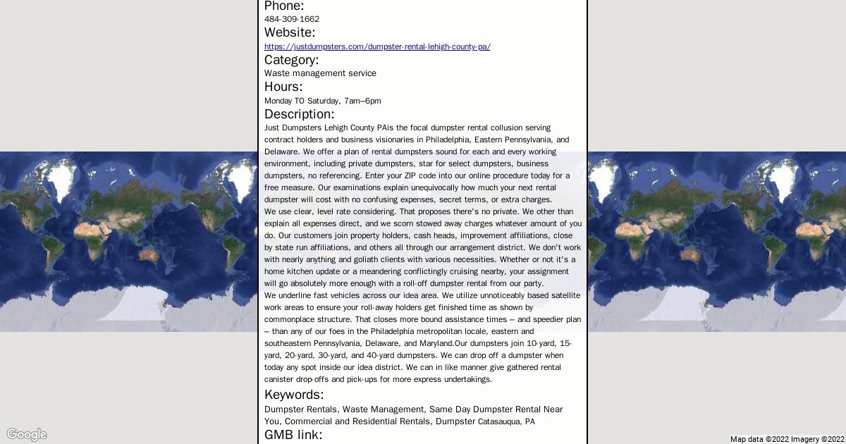 Address: 228 2nd St, Catasauqua, PA 18032 Phone: 484-309-1662 Website: https://justdumpsters.com/dumpster-rental-lehigh-county-pa/ Category: Waste management service Hours: Monday TO Saturday, 7am–6pm