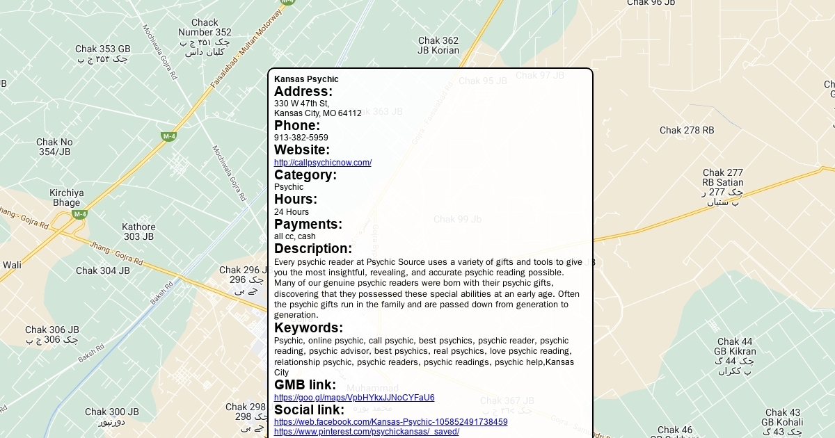 Address: 330 W 47th St, Kansas City, MO 64112 Phone: 913-382-5959 Website: http://callpsychicnow.com/ Category: Psychic