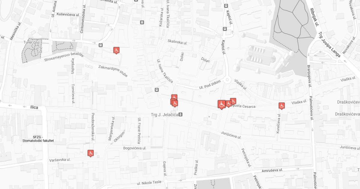 Karta s označenim kosinama za prijelaz invalida preko strujnih kablova postavljenih tijekom Adventa u Zagrebu 2019.
