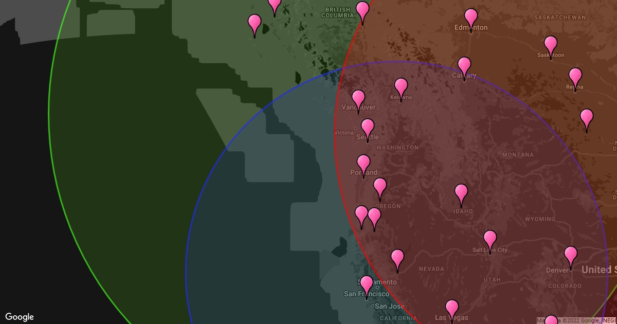 Green Circle - Vancouver Blue Circle - Reno Red Circle - Williston