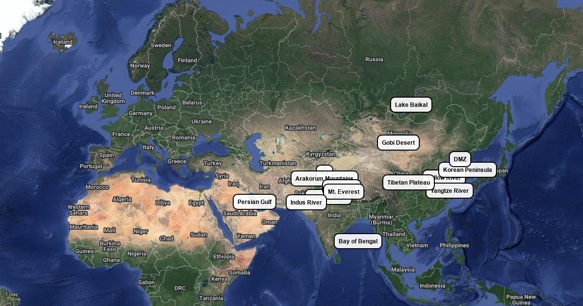 A map of physical features and landmarks in Asia.