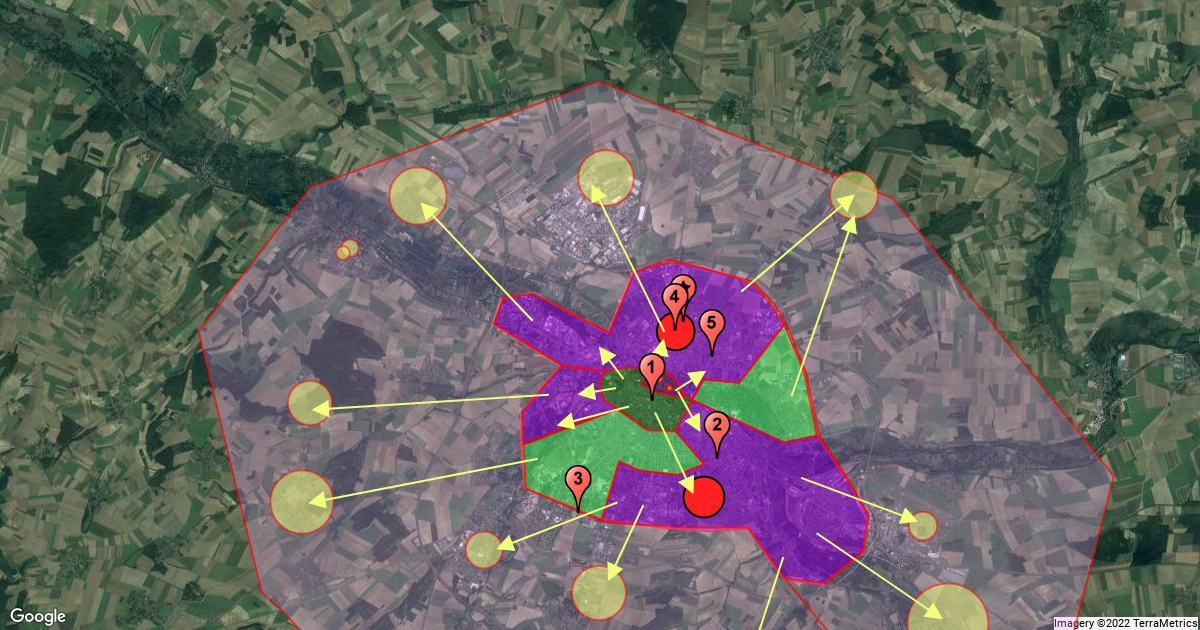 la couronne périurbaine qui entoure le pôle urbain composée de communes dont au moins 40% de la population travaille dans le pôle urbain.