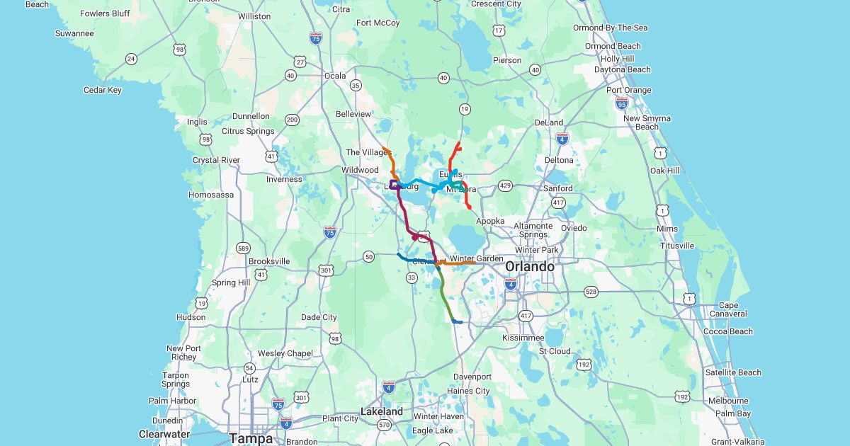 LakeXpress is a fixed-route public transit system in Lake County, FL, operating Monday-Friday (8 a.m. - 8 p.m.) with five main routes connecting areas like The Villages, Leesburg, Mount Dora, Altoona, and Mascotte. Route 1 serves U.S. 441, Route 4 covers SR 19 to Zellwood, and others serve downtown areas and Route 50 (Mascotte to Winter Garden).