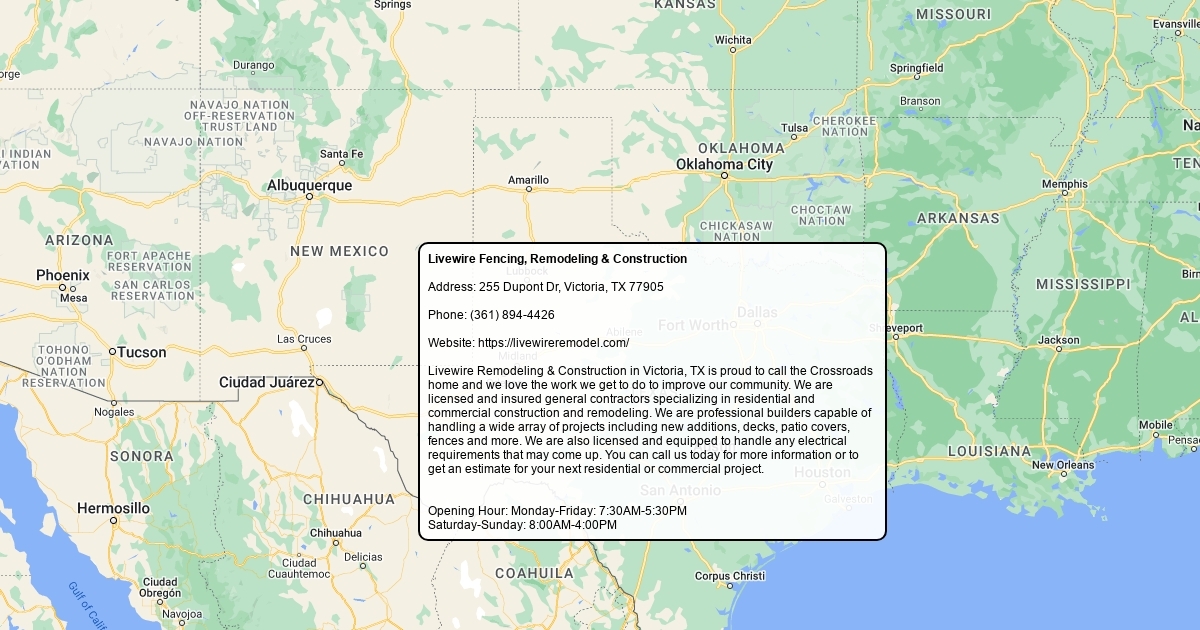 Livewire Remodeling & Construction in Victoria, TX is proud to call the Crossroads home and we love the work we get to do to improve our community. We are licensed and insured general contractors specializing in residential and commercial construction and remodeling. We are professional builders capable of handling a wide array of projects including new additions, decks, patio covers, fences and more. We are also licensed and equipped to handle any electrical requirements that may come up. You can call us today for more information or to get an estimate for your next residential or commercial project.