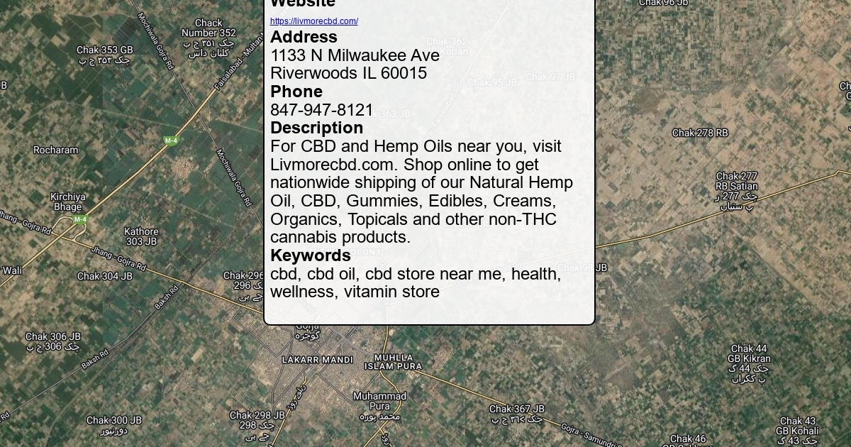 Website https://livmorecbd.com/ Address 1133 N Milwaukee Ave Riverwoods IL 60015 Phone 847-947-8121 Description For CBD and Hemp Oils near you, visit Livmorecbd.com. Shop online to get nationwide shipping of our Natural Hemp Oil, CBD, Gummies, Edibles, Creams, Organics, Topicals and other non-THC cannabis products. Keywords cbd, cbd oil, cbd store near me, health, wellness, vitamin store