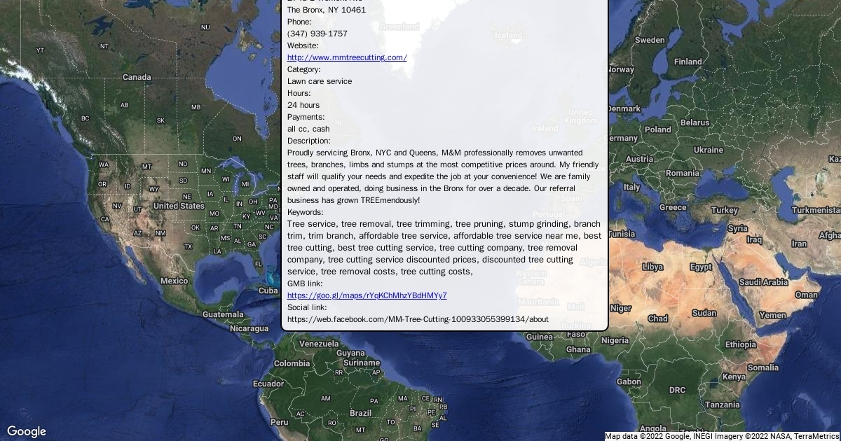 Address: 2748 E Tremont Ave The Bronx, NY 10461 Phone: (347) 939-1757 Website: http://www.mmtreecutting.com/ Category: Lawn care service Hours: 24 hours Payments: all cc, cash