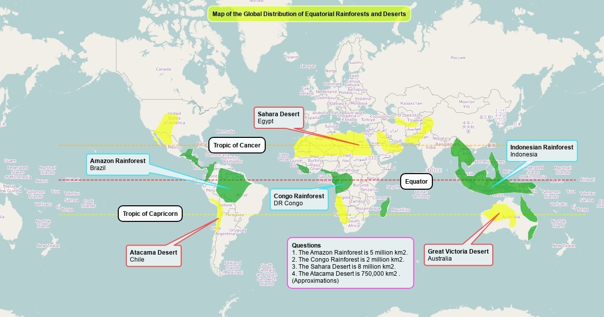 Map of the Global Distribution of Equatorial Rainforests and Deserts