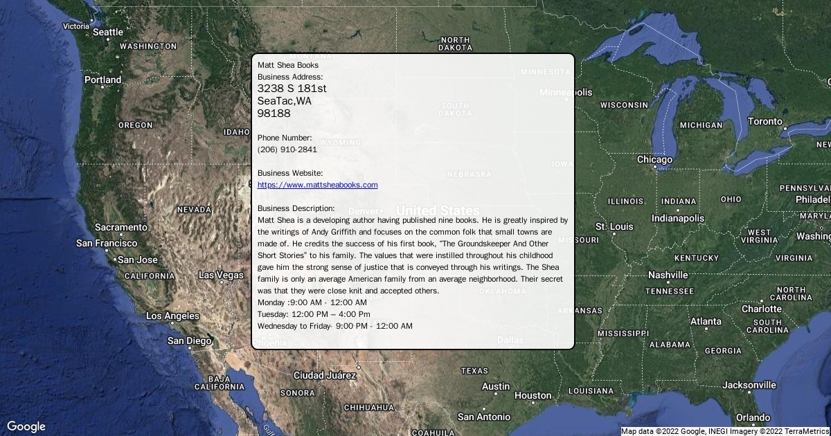 Matt Shea is a developing author having published nine books. He is greatly inspired by the writings of Andy Griffith and focuses on the common folk that small towns are made of. He credits the success of his first book, “The Groundskeeper And Other Short Stories” to his family. The values that were instilled throughout his childhood gave him the strong sense of justice that is conveyed through his writings. The Shea family is only an average American family from an average neighborhood. Their secret was that they were close knit and accepted others.