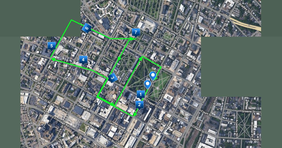 This is the route of our march through downtown New Haven on "May Day" May 1st, 2026. The start point and end point are both on the New Haven Green. There are 7 stops along the route.