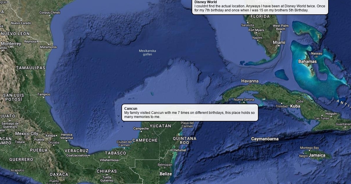 This is the Map of all my favorite places near America. These places are mostly on the east coast of America and one in Mexico