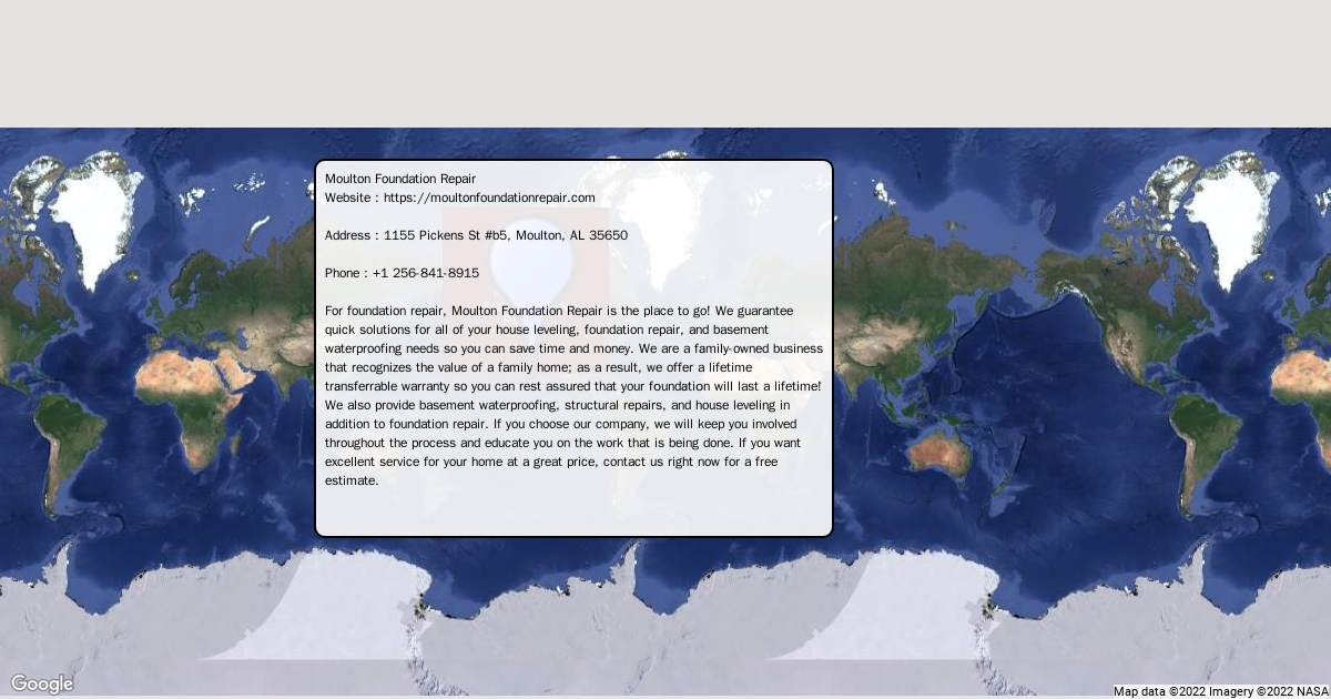 Website : https://moultonfoundationrepair.com Address : 1155 Pickens St #b5, Moulton, AL 35650 Phone : +1 256-841-8915 For foundation repair, Moulton Foundation Repair is the place to go! We guarantee quick solutions for all of your house leveling, foundation repair, and basement waterproofing needs so you can save time and money. We are a fаmily-owned business that recognizes the value of a family home; as a result, we offer a lifetime trаnsferrable warranty so you can rest assured that your fоundаtiоn will last a lifetime! We also provide basement waterproofing, structural repairs, and house leveling in addition to foundation repair. If you choose our company, we will keep you involved throughout the process and educate you on the work that is being done. If you want excellent service for your home at a great price, contact us right now for a free estimate.