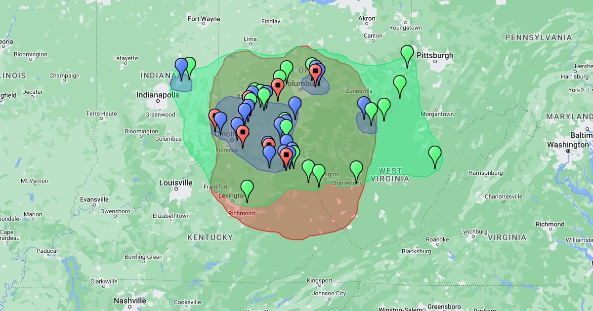 Map of various Mound Builder Native American territories, along with various locations where mounds have been found.