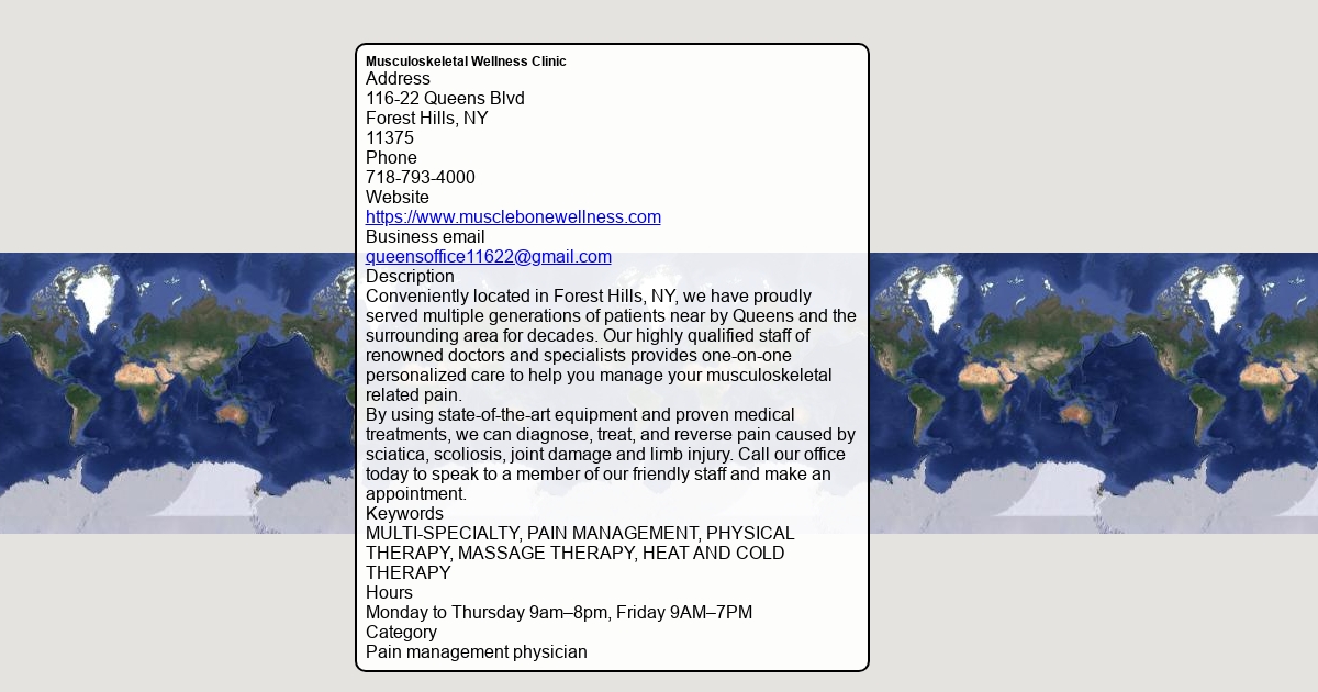 Conveniently located in Forest Hills, NY, we have proudly served multiple generations of patients near by Queens and the surrounding area for decades. Our highly qualified staff of renowned doctors and specialists provides one-on-one personalized care to help you manage your musculoskeletal related pain.
