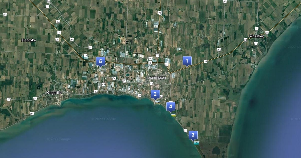 includes Thiessen orchards, Point pelee, erie golf course, colisantis, and seacliff beach