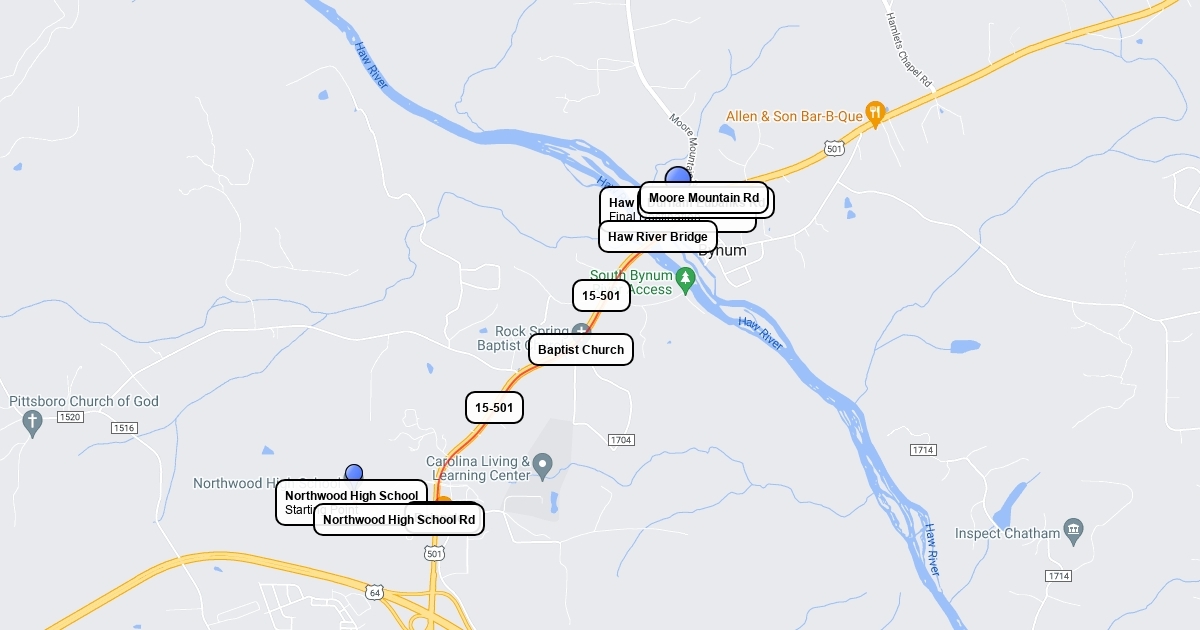 This map shows how to get from Northwood High School to the Haw RIver Access Point, both of which are located in Pittsboro, North Carolina.