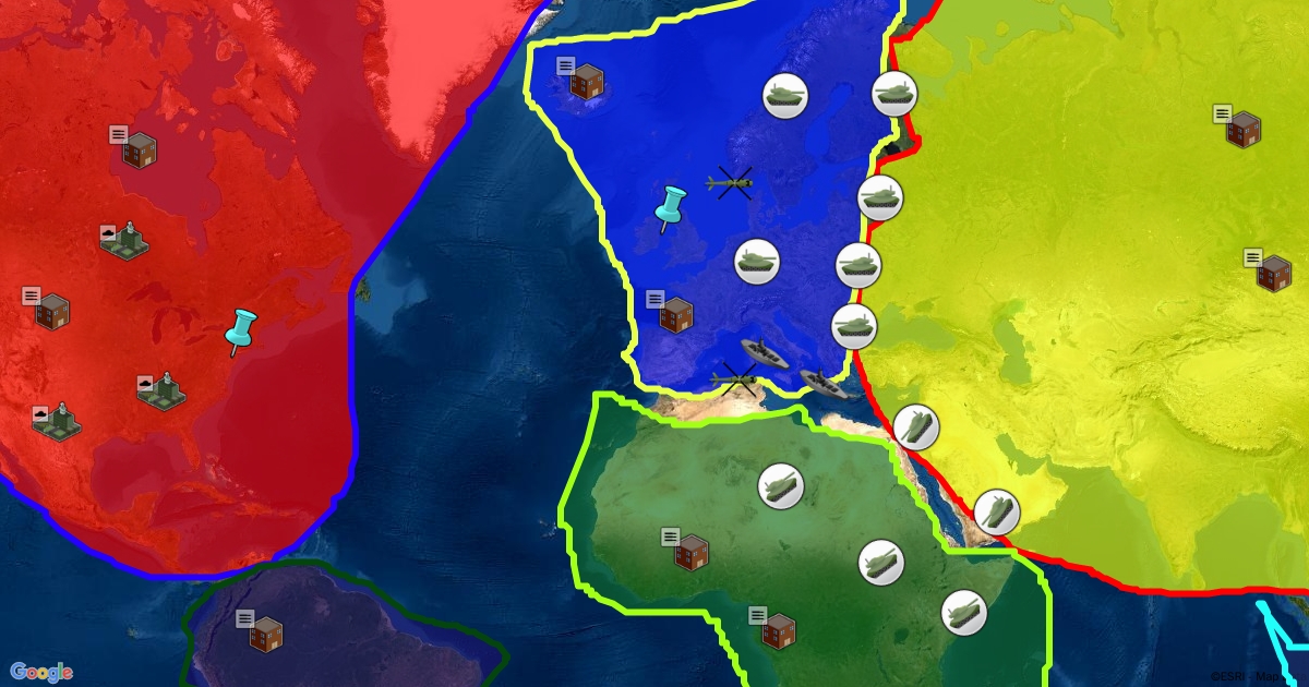 The world no longer has 200 nations....But only 6. The Asian Confederacy, The European Union, African Union, North American Union, The United States of South America and Pacifca...There is 2 factions the Western alliance (Blue Pins) and the New World Alliance (Red Pins). There is a huge massive war between the factions and has lasted for decades due to each continental super power having high amounts of resources and manpower.