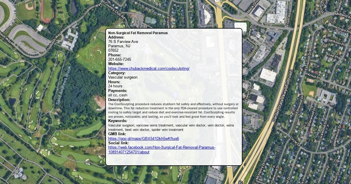Address: 76 S Farview Ave Paramus, NJ 07652 Phone: 201-655-7245 Website: https://www.chubackmedical.com/coolsculpting/ Category: Vascular surgeon Hours: 24 hours Payments: all cc, cash Description: The CoolSculpting procedure reduces stubborn fat safely and effectively, without surgery or downtime. This fat reduction treatment is the only FDA-cleared procedure to use controlled cooling to safely target and reduce diet and exercise-resistant fat. CoolSculpting results are proven, noticeable, and lasting, so you’ll look and feel great from every angle. GMB link: https://goo.gl/maps/GBX541Dkh5wKftuq6 Social link: https://web.facebook.com/Non-Surgical-Fat-Removal-Paramus-108914071254701/about
