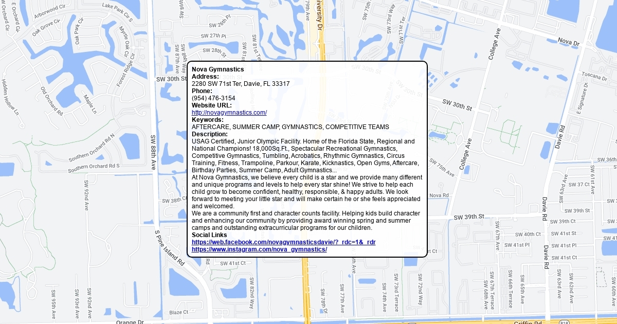 USAG Certified, Junior Olympic Facility. Home of the Florida State, Regional and National Champions! 18,000Sq.Ft., Spectacular Recreational Gymnastics, Competitive Gymnastics, Tumbling, Acrobatics, Rhythmic Gymnastics, Circus Training, Fitness, Trampoline, Parkour, Karate, Kicknastics, Open Gyms, Aftercare, Birthday Parties, Summer Camp, Adult Gymnastics...