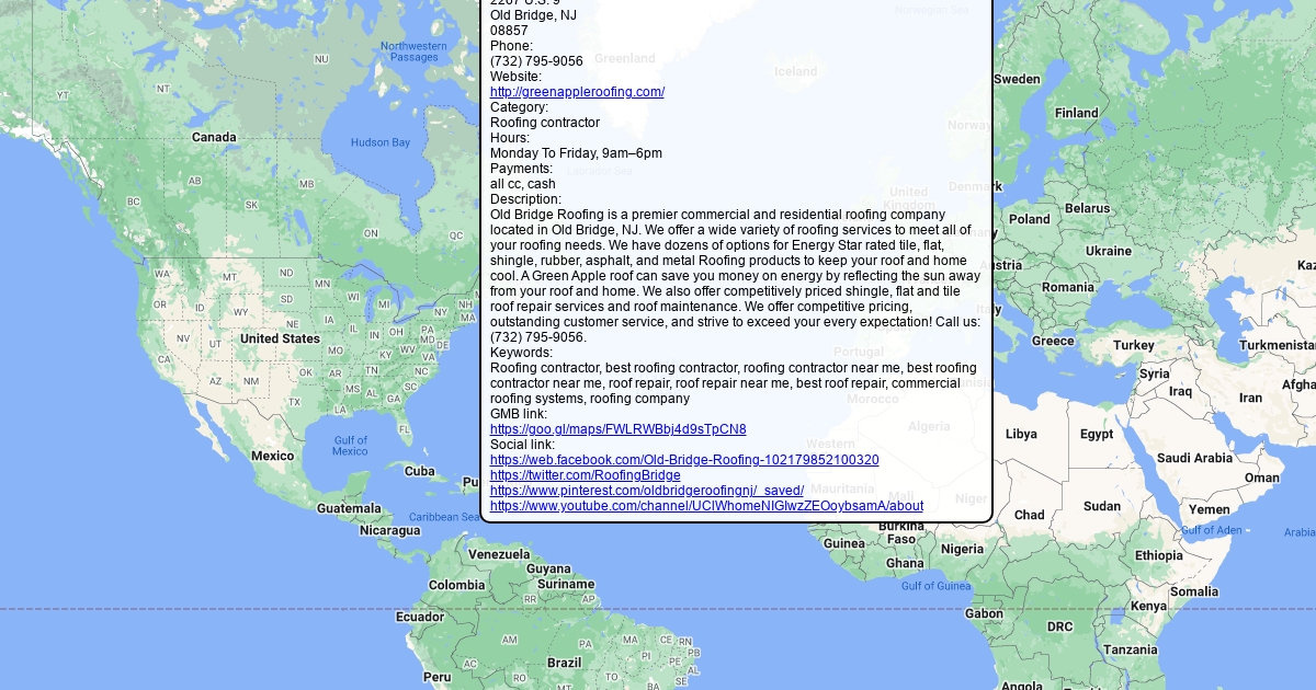Address: 2267 U.S. 9 Old Bridge, NJ 08857 Phone: (732) 795-9056 Website: http://greenappleroofing.com/ Category: Roofing contractor Hours: Monday To Friday, 9am–6pm Payments: all cc, cash