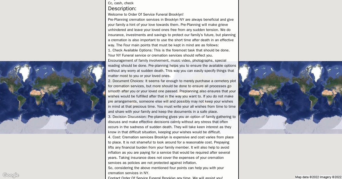 Address: 1918 W 5th St #521, Brooklyn, NY 11223 Phone: (347) 757-4524 Website: https://www.bigapplefuneral.com/funeral/ Category: funeral home Hours: 24 Hours Payments: Cc, cash, check