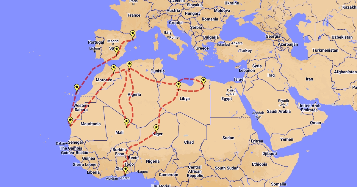 La ruta que realizó Ousman Umar para llegar a Europa, desde su pueblo natal.