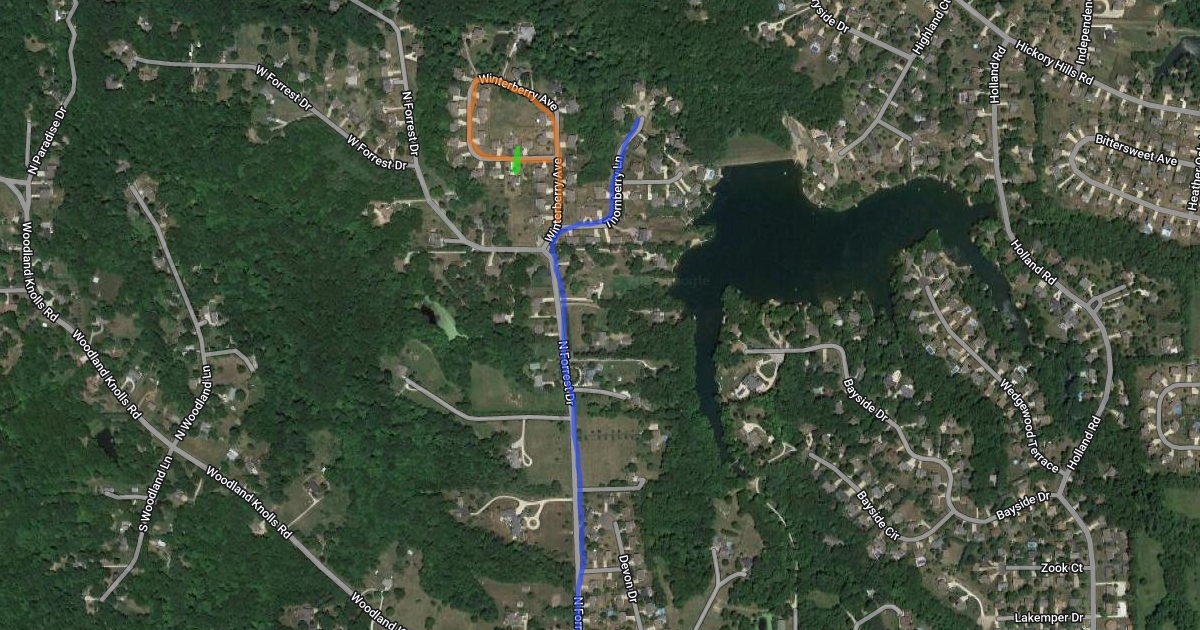follow the blue line to line up for the parade. Follow the orange line 2 times to drive by our house in bright green.