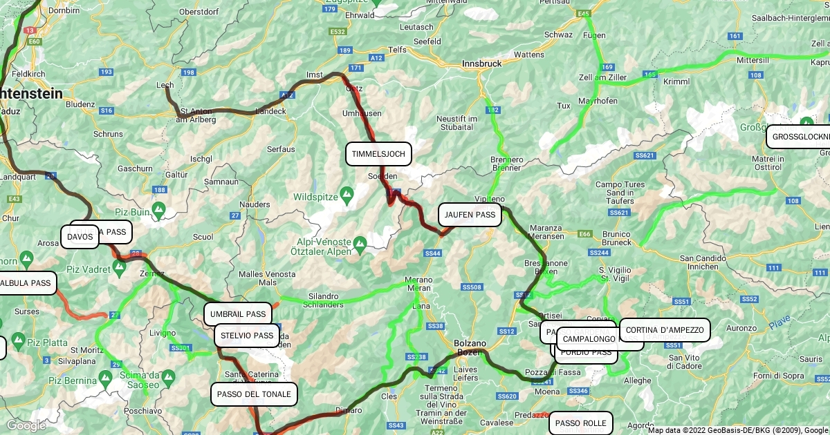 Points of interest (passes and places linked by recommended roads from Bestbikingroads.com