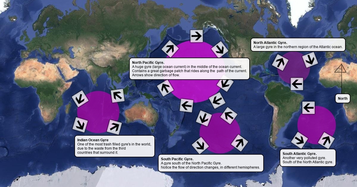 A map that shows the gyres of the world, and the directional flow of them.