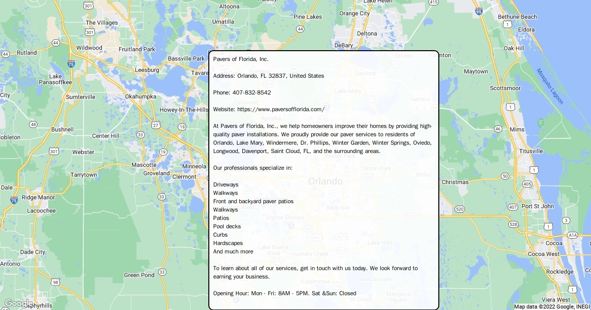 At Pavers of Florida, Inc., we help homeowners improve their homes by providing high-quality paver installations. We proudly provide our paver services to residents of Orlando, Lake Mary, Windermere, Dr. Phillips, Winter Garden, Winter Springs, Oviedo, Longwood, Davenport, Saint Cloud, FL, and the surrounding areas. Our professionals specialize in: Driveways Walkways Front and backyard paver patios Walkways Patios Pool decks Curbs Hardscapes And much more To learn about all of our services, get in touch with us today. We look forward to earning your business.