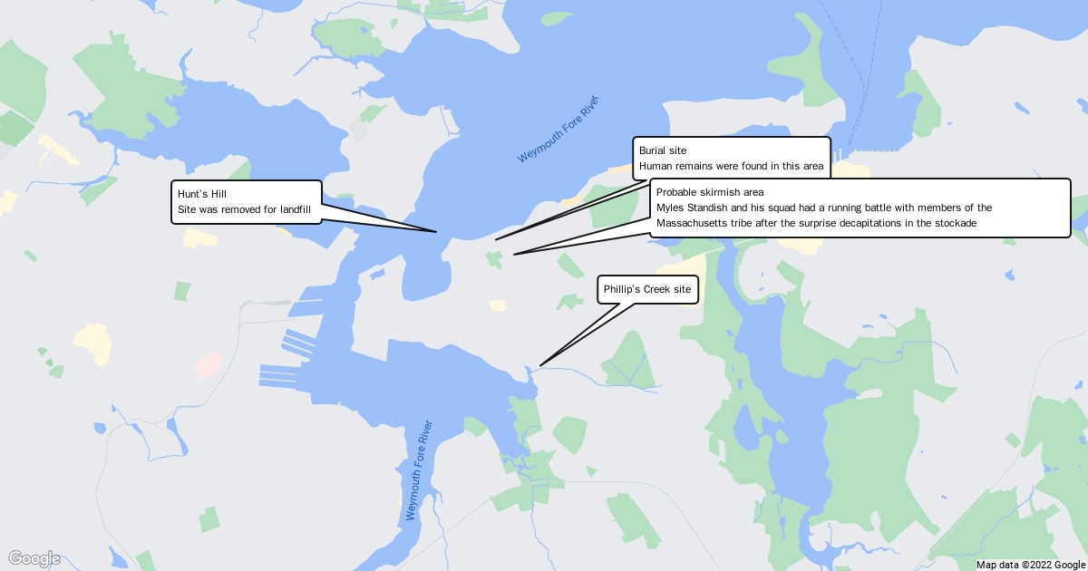 The London merchants who backed the Plymouth Plantation sent a group of merchants to establish beaver fur trading with the Massachusetts tribe. It was an ill fated endeavor that resulted in an infamous attack on the natives by Myles Standish and a small groupf of soldiers. The exact location of the stockade in current-day North Weymouth, Massachusetts is a subject of debate.