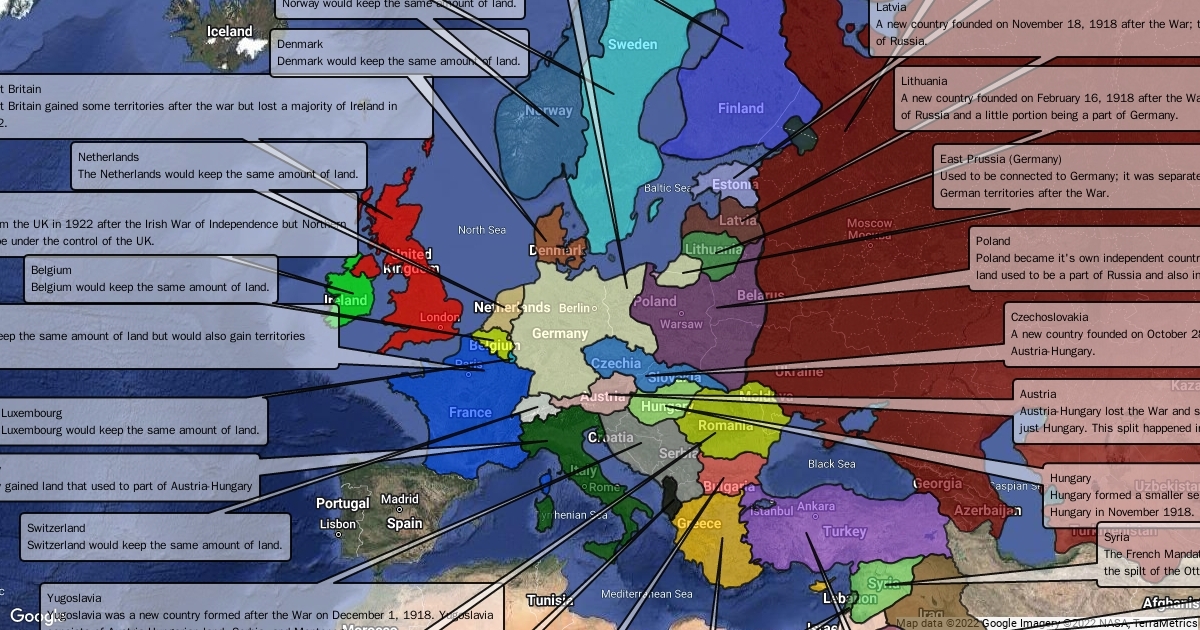 A map providing the new political boundaries of Europe as well the new countries formed.