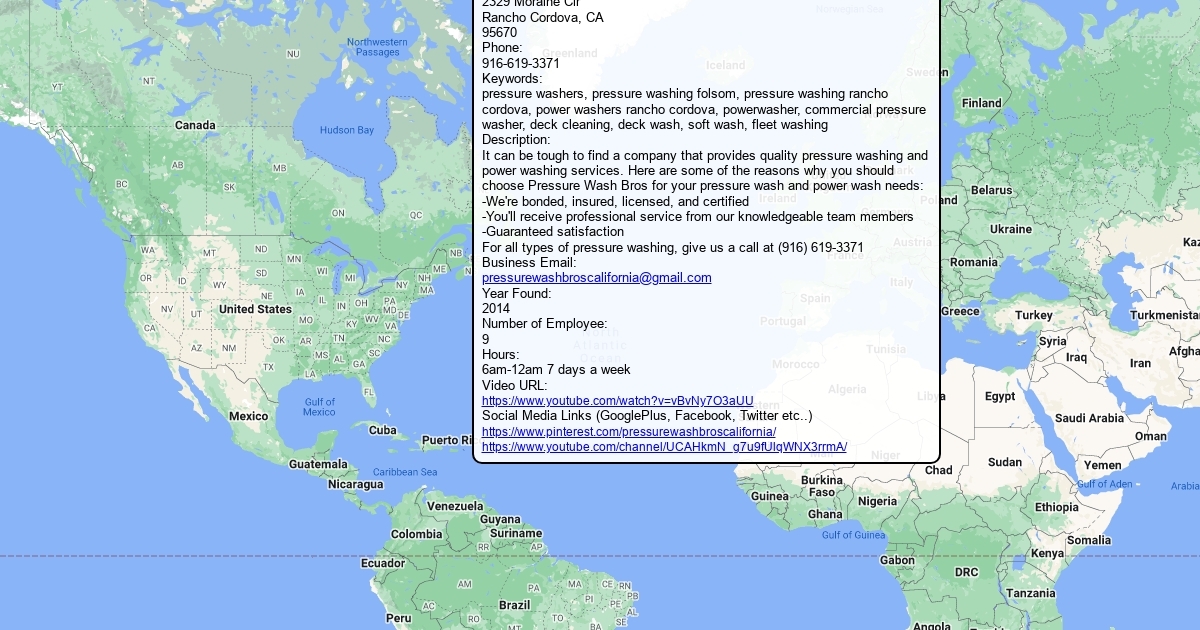Website: https://pressurewashbros.com Full Address: 2329 Moraine Cir Rancho Cordova, CA 95670 Phone: 916-619-3371