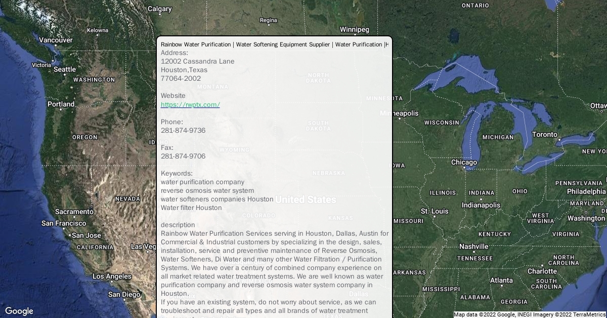 When it comes to true value, Rainbow Water Purification can provide you with the value you need for your business. We are committed to providing our customers with the best service at the lowest possible cost. Visit us at 12002 Cassandra Lane Houston,Texas 77064-2002 USA or at our