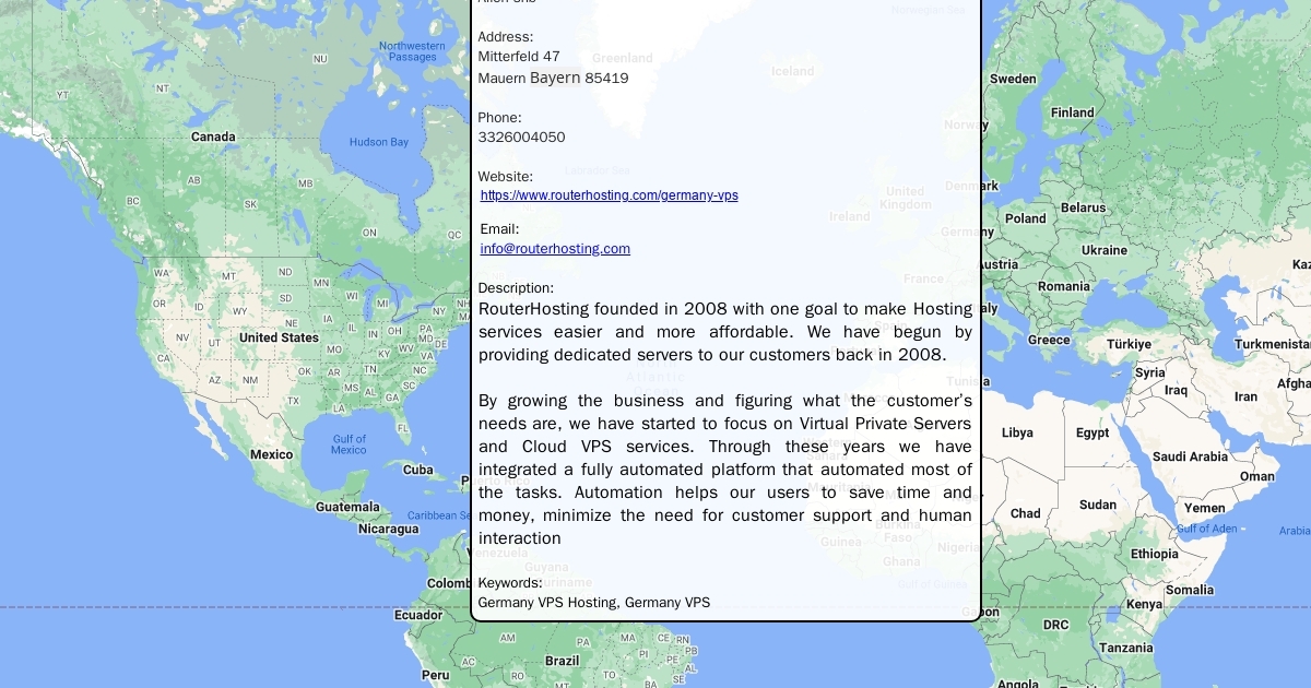 Contact Name: Allen shb Address: Mitterfeld 47 Mauern Bayern 85419 Phone: 3326004050 Website: https://www.routerhosting.com/germany-vps Email: info@routerhosting.com