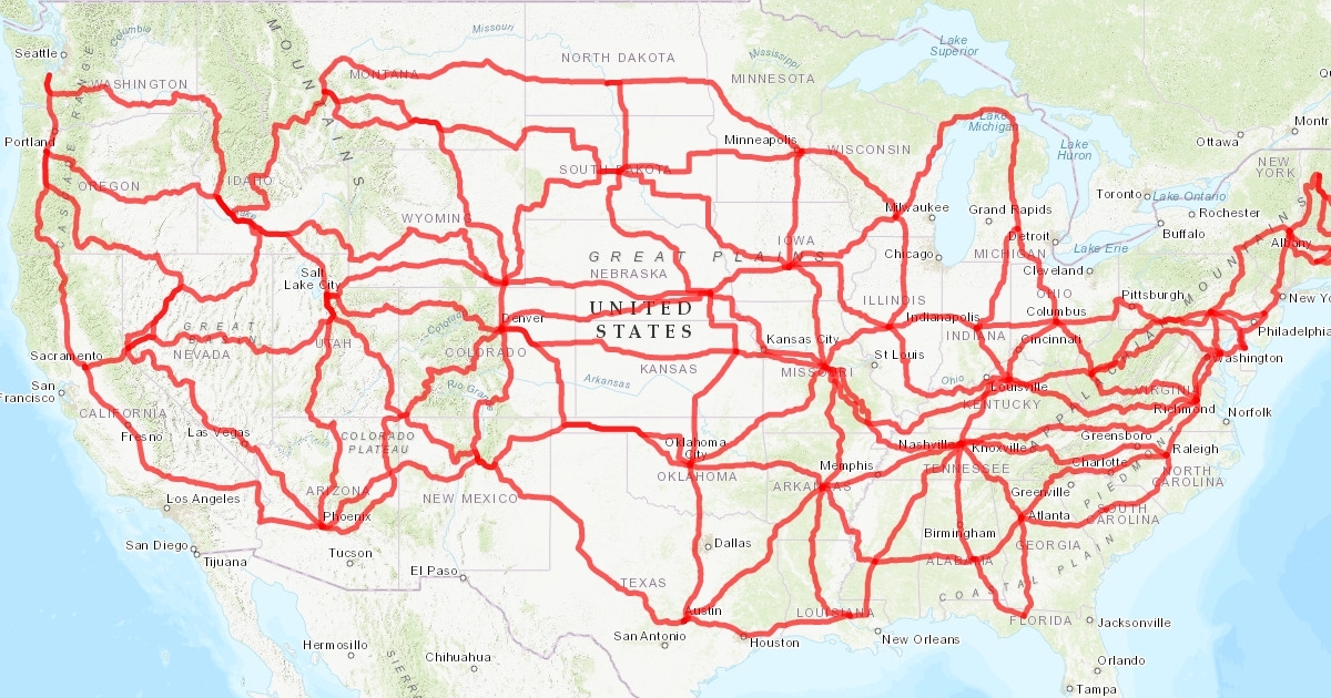 This is a map of the routes between 48 U.S. Capitals in the contagious USA. Between two states only with a few exceptions to the Four Corners States.
