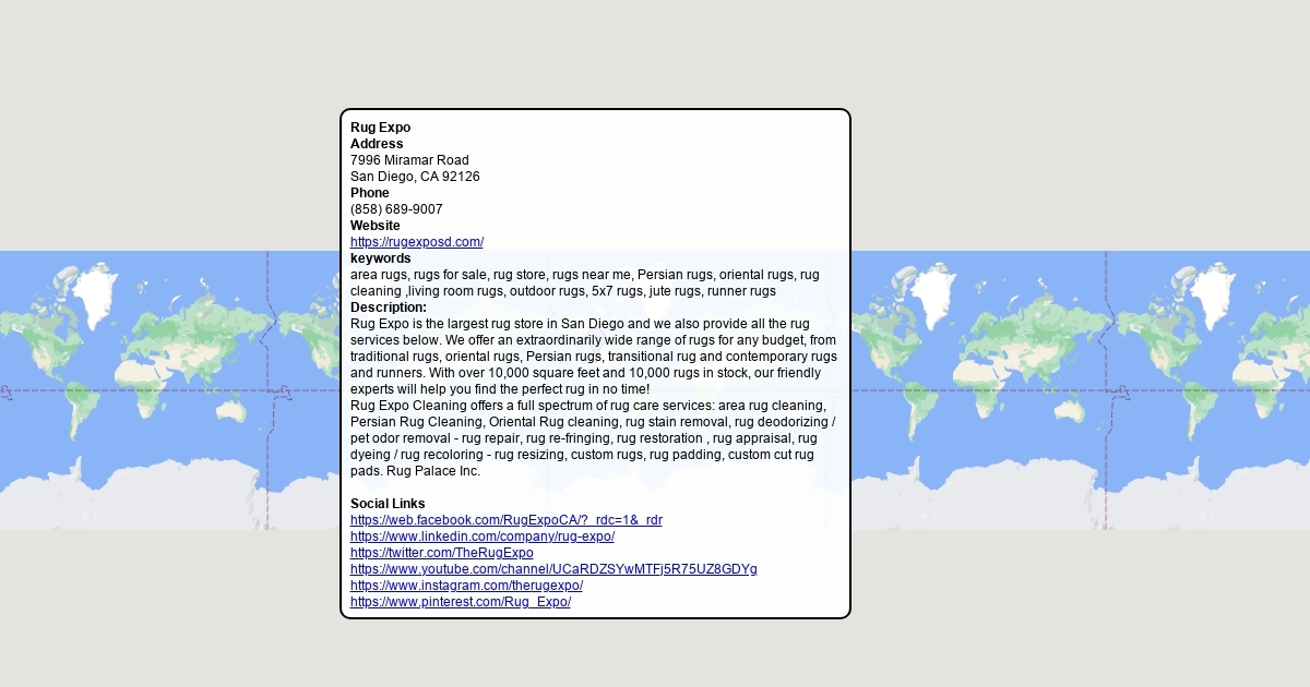 Address 7996 Miramar Road San Diego, CA 92126 Phone (858) 689-9007 Website https://rugexposd.com/ keywords area rugs, rugs for sale, rug store, rugs near me, Persian rugs, oriental rugs, rug cleaning ,living room rugs, outdoor rugs, 5x7 rugs, jute rugs, runner rugs Rug Expo is the largest rug store in San Diego and we also provide all the rug services below. We offer an extraordinarily wide range of rugs for any budget, from traditional rugs, oriental rugs, Persian rugs, transitional rug and contemporary rugs and runners. Social Links https://web.facebook.com/RugExpoCA/?_rdc=1&_rdr https://www.linkedin.com/company/rug-expo/ https://twitter.com/TheRugExpo https://www.youtube.com/channel/UCaRDZSYwMTFj5R75UZ8GDYg https://www.instagram.com/therugexpo/ https://www.pinterest.com/Rug_Expo/
